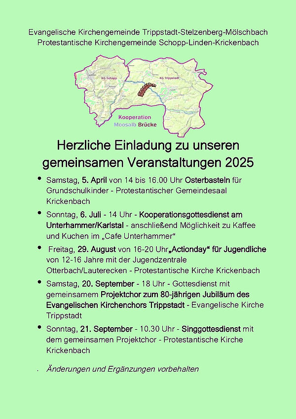 Auf der Gemeindeebene sind gemeinsame Gottesdienste geplant, ebenso gemeinsames Singen im Kirchenchor Trippstadt sowie für die Zukunft die Neubelebung der Kindergottesdienstarbeit.