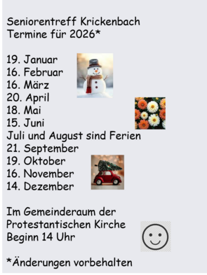 In der Regel am 3. Montag im Monat treffen sich ab 14 Uhr Seniorinnen und Senioren Ü60 ab 14 Uhr zu einem bunt gemischten Miteinander im Protestantischen Gemeindesaal Krickenbach.
