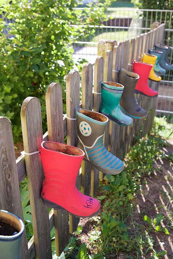 Draußen: großes naturnahes Außengelände, Sandspielplatz mit Sonnensegel, Wasserlauf, Gemüse- und Kräutergarten, Spielgeräte, Weidenhäuschen, Bauwagen und Kinderbaustelle.