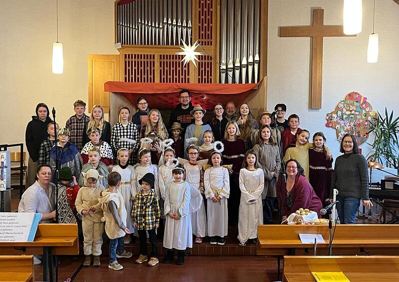 Die Schopper Kinder und Jugendlichen erzählen, singen und spielen „Die Weihnachtsgeschichte“ rund um die Geburt Jesu in Bethlehem: Auf dem Marktplatz von Nazareth herrscht reges Treiben. Plötzlich kommt ein Bote des Kaisers und fordert die Menschen auf, sich in ihrer Geburtsstadt zählen zu lassen. Auch Maria und Josef machen sich auf den Weg. Die Herbergen in Bethlehem sind überfüllt. Sie müssen in einem ärmlichen Stall bei Ochs und Esel übernachten. Dort bekommt Maria ihr Kind. In dieser außergewöhnlichen Nacht kommen auch Hirten, Engel und Könige zum Stall. Sie alle wollen das Kind sehen, das den Menschen Frieden, Liebe und Hoffnung bringen soll. Musikalisch live umrahmt wird der ökumenische Familiengottesdienst an Heiligabend von traditionellen und modernen Weihnachtsliedern. Das „Licht des Weihnachtsgottesdienstes“ wird gerne mit nach Hause genommen. Folgende Kinder, Jugendliche und Erwachsene haben den Familiengottesdienst gemeinsam vorbereitet und mitgestaltet: Annika, Bella, Carla, Clara, Eike, Elenor, Elias, Emelie, Emilia, Emilie, Emma, Emma, Fabian, Frieda, Greta, Johanna, Klara, Leann, Leon, Leonie, Lian, Luike, Luis, Lukas, Mathilda, Maximilian, Mila, Moritz, Nele, Niclas, Nora, Nora, Ria, Simon, Winfried. Das Krippenspielteam 2025 Annette, Pascal, Simone und Sonja