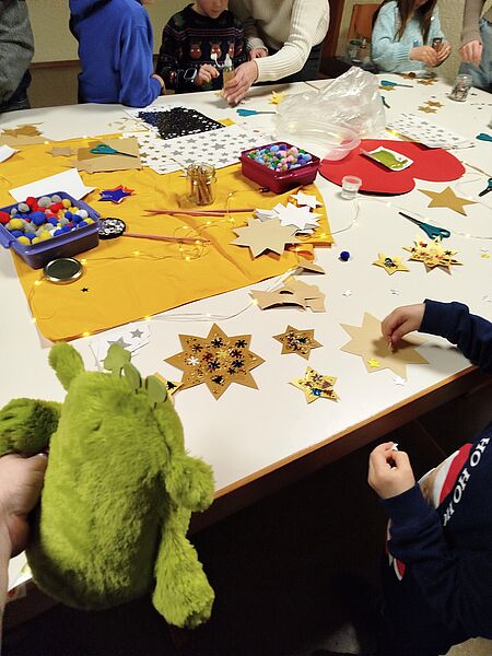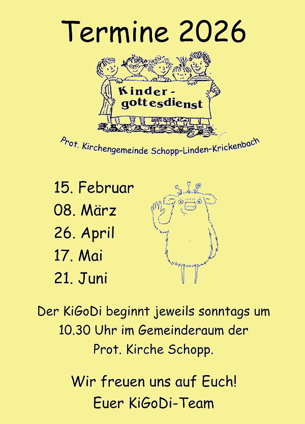 Im Jahr 2025 haben wir den Schopper Kindergottesdienst (KiGoDi) wieder aufleben lassen. Mit neuen Ideen und Motivation trafen wir uns im Sommer, um die ersten Termine zu planen. Ende August starteten wir mit dem Eröffnungs-KiGoDi im Rahmen des Sonntagsgottesdienstes mit Herrn Pfarrer Hust in der Prot. Kirche Schopp. Er stellte in einer Geschichte über Gemeinschaft das „kleine WIR“ vor, welches uns als Maskottchen zukünftig im KiGoDi begleiten wird. Der erste KiGoDi fand im September im Gemeinderaum der Prot. Kirche statt. Wir hörten, dass das „kleine WIR“ glücklich ist, wenn wir gemeinschaftlich und freundlich miteinander umgehen. Streit und Ungerechtigkeiten mag das „Wir“ hingegen gar nicht. Der KiGoDi im Oktober behandelte das Thema Dankbarkeit und Erntedank. In einer gemütlichen Runde tranken wir Tee und dankten Gott für seine Gaben. Zudem gestalteten wir bunte Herbstbäume mit Fingerfarben. Im November leuchteten viele Lichter im KiGoDi und wir erfuhren, dass Gott Licht ins Dunkel bringt. Passend dazu bastelten wir leuchtende Teelichtgläser. Im Dezember trafen wir uns zur Sternstunde und hörten, was der kleine Stern auf dem Weg zur Krippe erlebte. Nach gemeinsamem Basteln von glitzernden Sternen feierten wir die Eröffnung des Adventsfensters unserer Kirche. Wir erfreuen uns an der wachsenden Anzahl der Kinder und bedanken uns bei allen für die großartigen gemeinschaftlichen Treffen. Außerdem freuen wir uns sehr, Euch alle gesund und munter am 11.01.2026 um 10:30 Uhr bei unserem ersten Kindergottesdienst im neuen Jahr zu begrüßen. Euer KiGoDi Team: Annika, Bella, Brigitte, Emilie, Frieda, Hannah, Monika, Natalie, Steffi und das kleine WIR
