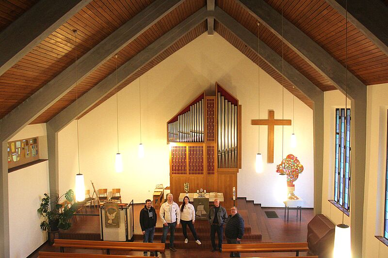 Als im Sommer 2023 ein massiver Feuchtigkeitseinlass an der Giebelwand der Protestantischen Kirche Schopp festgestellt wurde, war die Bestürzung im Presbyterium groß. Gerade war die aufwändige Fassadensanierung der Kirche abgeschlossen. Die Ursache für die feuchte Wand war eine über die Jahre hin verstopfte Regenrinne, die durch ein Dach-Kupferblech über dem Ortgang der Giebelwand versteckt ist. Niemand wusste von dieser Rinne. Gleich wurde ein von dem Fundraisingbeauftragten des Protestantischen Kirchenbezirks an Alsenz und Lauter, Herrn Ronald Rosenthal online eingerichteter Spendenaufruf gestartet. Der Aufwand hat sich gelohnt. Es kam eine stattliche Spendensumme zusammen, die jedoch die Kosten für die Sanierungsarbeiten nicht voll decken konnte. Zu Beginn des Jahres 2026 erhielt Ortspfarrer Wolfgang Hust die Nachricht der ortsansässigen Sanierungs- und Malerfirma Thomas, dass diese die Arbeit komplett und kostenlos für die Kirchengemeinde übernehmen würde. Die Überraschung war groß, die Freude umso mehr über diesen Synergieeffekt des Spendenaufrufs. Im Februar konnten die Arbeiten begonnen und innerhalb von 3 Wochen abgeschlossen werden. Eine große Wandfläche im Giebelbereich wies schadhaften Putz auf. Dieser wurde fachmännisch saniert. Darüber hinaus erhielten die Seitenwände des Langschiffs sowie die Betonrippen im unteren Bereich einen frischen Anstrich mit Spezialfarbe. Bei einem Fototermin überreichten die Schopper Presbyter den fleißigen Mitarbeitern der Firma Thomas, Frau Müssiggang und Herrn Steigner, eine Präsentkiste als Dankeschön. Herzlichen Dank allen, die diese großartige und hilfreiche Aktion unterstützt haben, besonders der Firma Thomas mit ihrem Geschäftsführer Uli Becker sowie Herrn Rosenthal als Initiator und Unterstützer der Spendenaktion. Die bereits eingegangenen Spenden für die Giebelwandsanierung fließen nun nach Rücksprache mit den Spender*innen in die allgemeinen Instandhaltung der Schopper Kirche.
