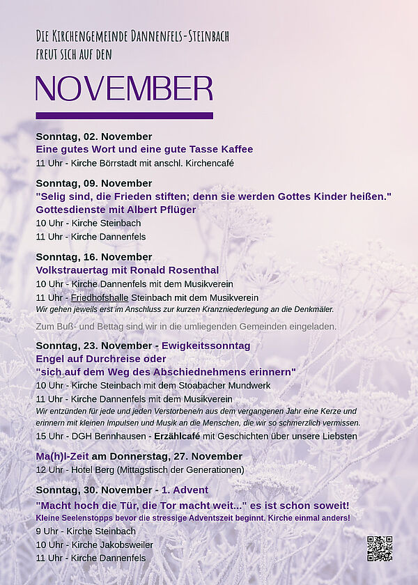 Im Gemeinschaftshaus in Bennhausen und in der Prot. Kirche in Jakobsweiler kommen wir immer an den Feiertagen zusammen und feiern neben besonderen Sonntags-Gottesdiensten "Kirche einmal anders".