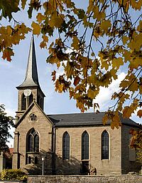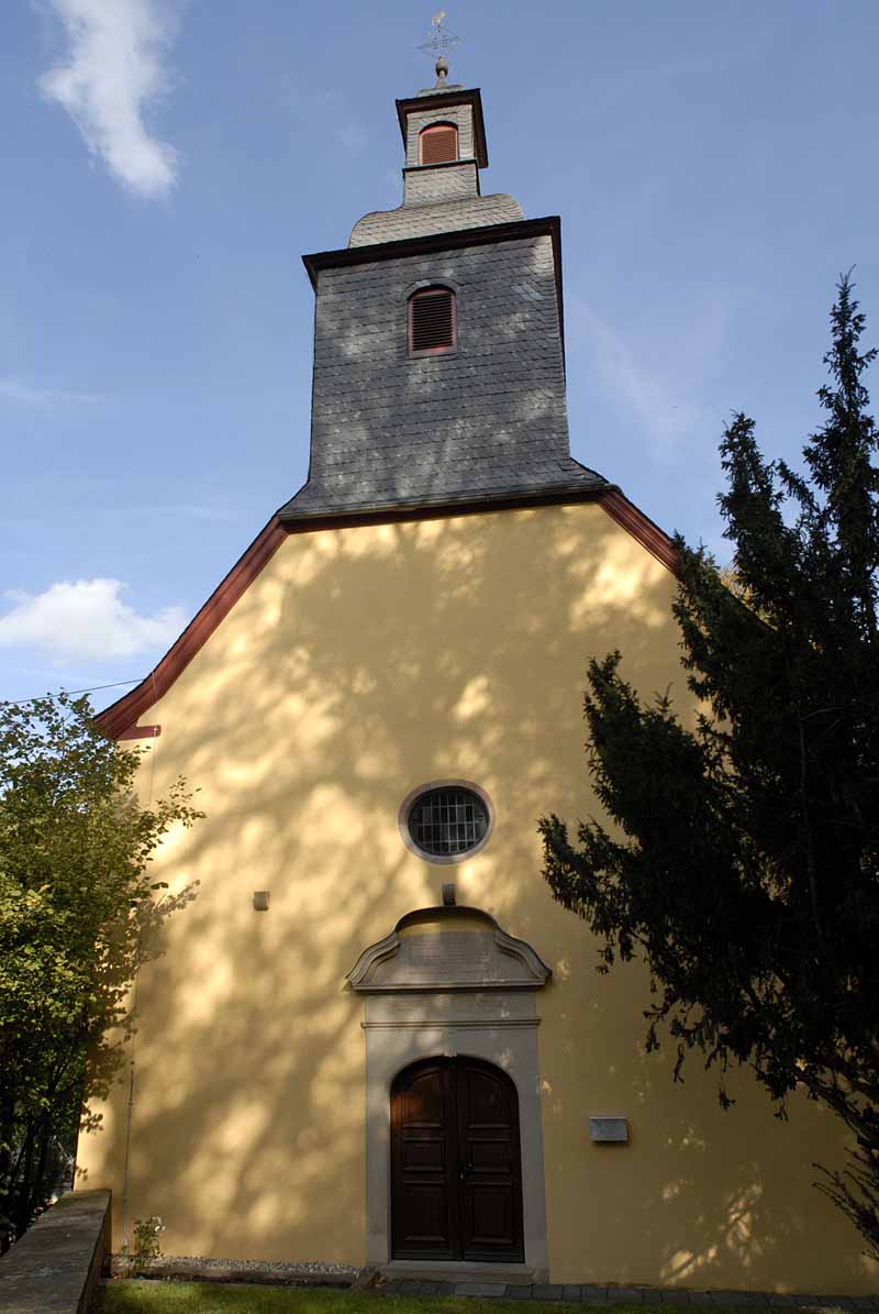 Die mittelalterliche Pfarrkirche war dem heiligen Laurentius geweiht. 1552 wurde durch die Wild- und Rheingrafen die lutherische Reformation eingeführt. Die jetzige Pfarrkirche wurde 1723 errichtet, offenbar an der Stelle, an der einst das frühere Gotteshaus stand. Weil eine große Zahl von Gemeindegliedern besonders während der Festtage keinen Sitzplatz fand, musste die Kirche schon 1790 erweitert werden. Weitere Renovierungen waren 1823, 1894, 1931 und 1962 erforderlich. Die Kirche begegnet uns heute als ein Saalbau. Das gedrückte Tonnengewölbe ist ohne Gesims. Die bogigen Fenster haben eine Einrahmung aus Hausteinen. Über dem Westportal berichtet eine Inschrift, dass die Kirche unter der Herrschaft des Herzogs Gustav Samuel Leopold von Zweibrücken und des Rheingrafen Karl von Daun erbaut wurde und der amtierende Pfarrer Johannes Feuerbach hieß. Über dem Südportal ist das Wort aus 1. Mose 28,17 zu lesen: „Hie ist nichts anderes denn Gottes Haus und hie ist die Pforte des Himmels.“