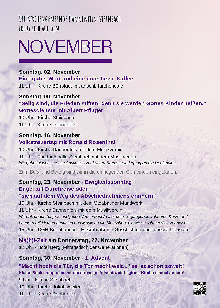 Bitte auf Aktuelles achten und gerne bei Pfrin. Rust-Bellenbaum oder den Presbytern nachfragen. Wir freuen uns wenn Besuchswünsche und Anregungen, Sorgen und Fragen auch an uns herangetragen werden. Dann geht niemand verloren.