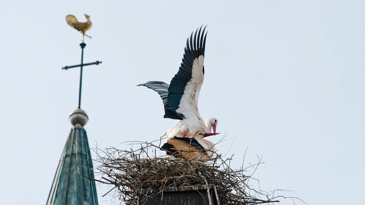 Störche genießen beheiztes Nest auf der Kirche: Artikel von evangelisch.de Klick hier